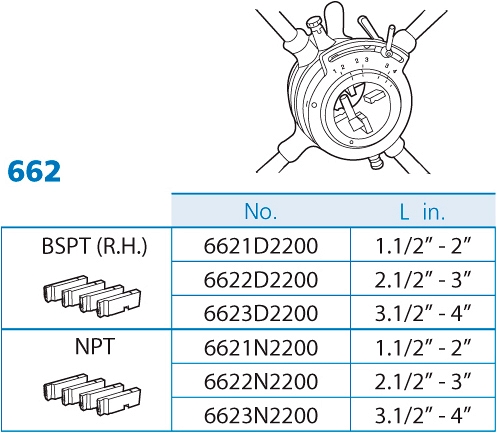 Клупп трубный регулируемый Super-Ego 662 Set 1 1/2"-3" BSPT R (Супер-Эго 662 Сет 1 1/2"-3" БСПТ Р) предназначен для быстрой и качественной нарезки правой конической трубной резьбы BSPT R на стальных трубах Ø 1 1/2" – 3" на стройплощадке при монтаже систем газо- и водоснабжения, отопления, в котлостроении и производстве.