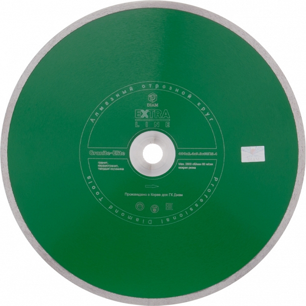 Круг отрезной алмазный Diam Extra Line 1A1R Корона Granite-Elite 400 мм (Диам Экстра Лайн 1А1Р Корона Гранит-Элит 400 мм) – премиальный алмазный диск без слотов для мокрой резки гранита, керамогранита, твердой керамики, кварцевого агломерата, оникса, мрамора, габбро, лабрадорита, базальта и других пород твердого натурального камня на бензорезах, электрических резчиках, камнерезных станках, стенорезных машинах, швонарезчиках с подачей воды. За долгое время зарекомендовал себя с отличной стороны у многих мастеров, как инструмент, обеспечивающий очень качественное выполнение задач практически по всем твердым материалам, при этом имеет очень большой ресурс и скорость работы.