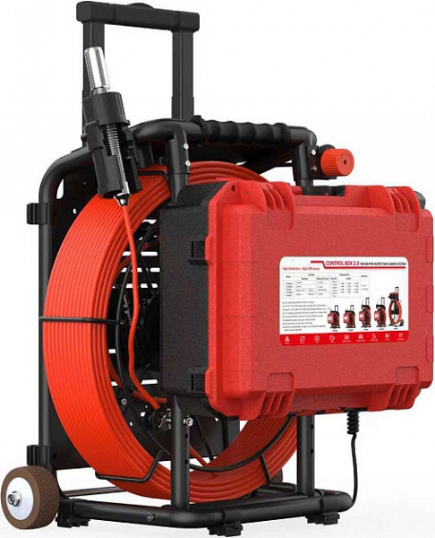 - Головка камеры Ø 21 × 45 мм и проталкиваемый кабель Ø 5,3 мм × 40 м из стекловолокна со счетчиком длины и системой торможения, подходящие для труб Ø 50 – 125 мм, длиной до 40 м