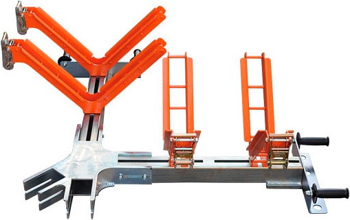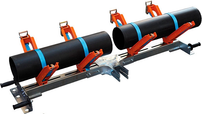 - Оси имеют 2 направляющие, по которым скользят специальные V-образные зажимы (опоры), оснащенные крепежными ремнями для фиксации сегментов труб перед сварочным процессом