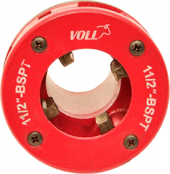 Резьбонарезная головка для ручного клуппа Voll BSPT R SS 1 1/2" (Волл БСПТ Р СС 1 1/2") предназначена для нарезания правой трубной конической резьбы BSPT R на стальных водо- и газопроводных трубах Ø 1 1/2". Идеально подходит для использования в ручных резьбонарезных клуппах Voll, с использованием смазочно-охлаждающей жидкости Voll. Может использоваться с электрическими и ручными клуппами некоторых других производителей (совместимость уточняйте у специалистов).