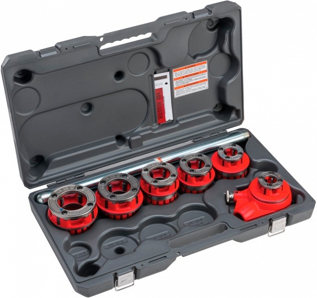 - Все резьбонарезные наборы оснащены универсальной ручной трещоткой, позволяющей крутить резьбонарезные головки в сборе от 1/8" до 2". На фиксаторе резьбонарезной головки указано направление вперед и назад. Резьбонарезные головки вставляются с обеих сторон, защелкиваются в трещотке и вынимаются отщелкиванием кнопки