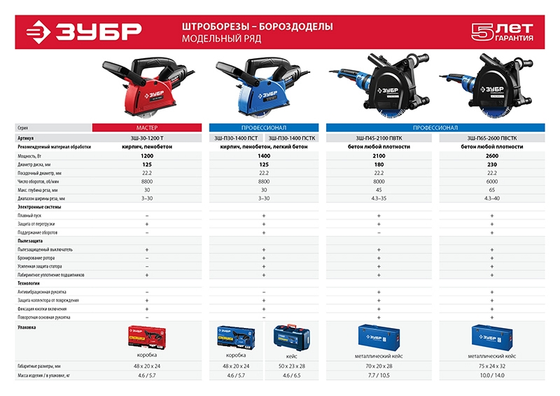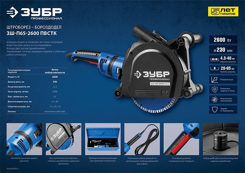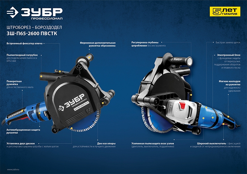 Преимущества штробореза Зубр Профессионал ЗШ-П65-2600 ПВСТК: