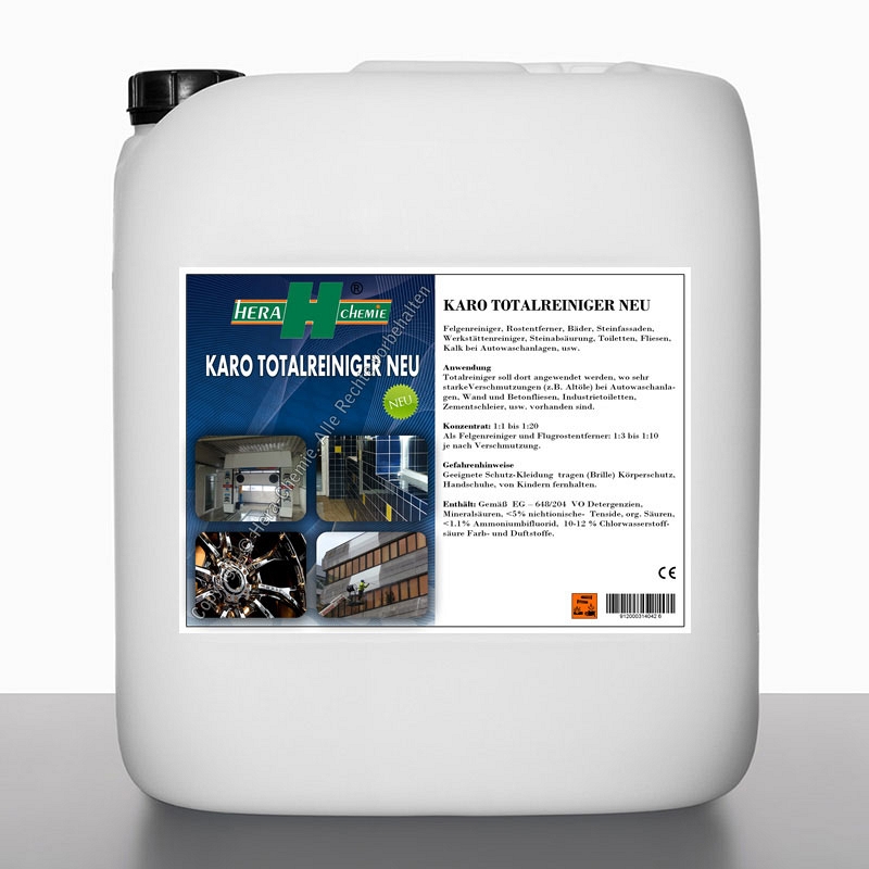 Универсальное профессиональное чистящее и моющее средство Hera Chemie Karo Totalreiniger (Хера Хими Каро Тоталрайнигер) предназначено для очистки металлоформ от наслоения бетонного «молочка» 2 – 3 мм, остатков цементного раствора, удаления ржавчины, мойки емкостей из нержавеющей стали, каменных фасадов, мойки природного камня, мрамора, гранита, кирпича, керамогранита, керамических плиток, удаления известковых отложений на автомойках, удаление высолов на кирпичной кладке, очистка памятников и т.д. Не применяется для мойки пластика, зеркальных поверхностей, покрытий из хрома.
