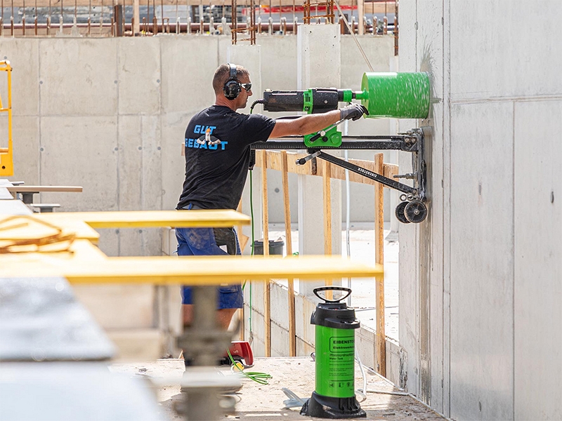 Установка алмазного бурения Eibenstock DBE 352 (Айбеншток ДБЕ 352) предназначена для мокрого сверления отверстий Ø 41 – 352 мм в железобетоне, кирпиче, натуральном камне и асфальте в гражданском и промышленном строительстве, при проведении электромонтажных работ, монтаже систем водоснабжения, отопления, вентиляции и других инженерных сантехнических коммуникаций.